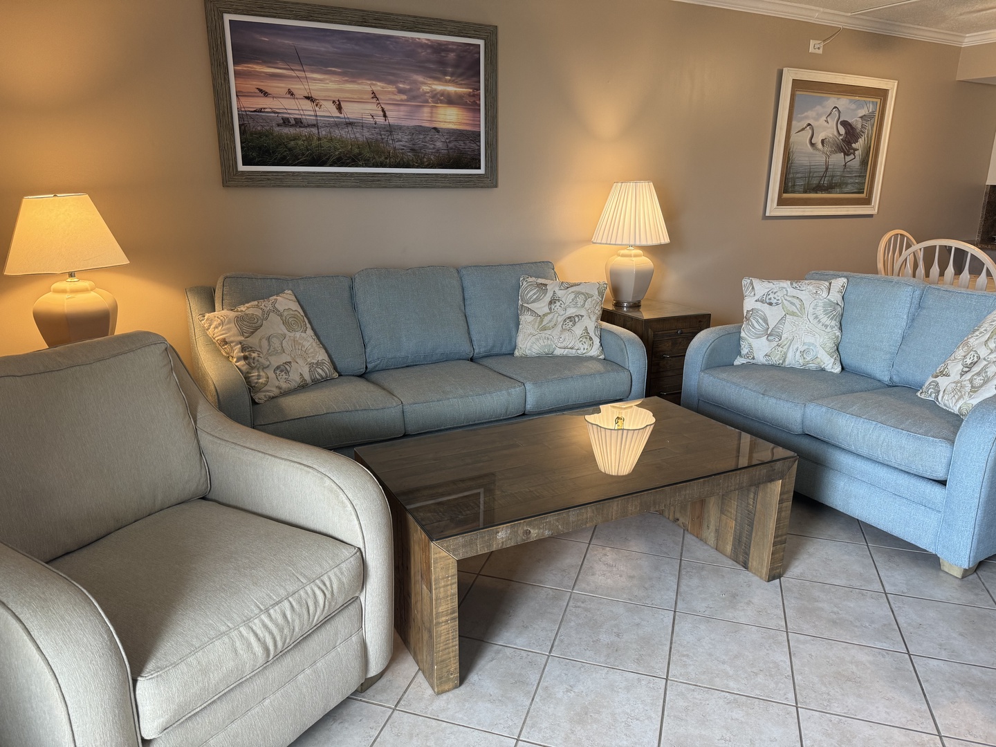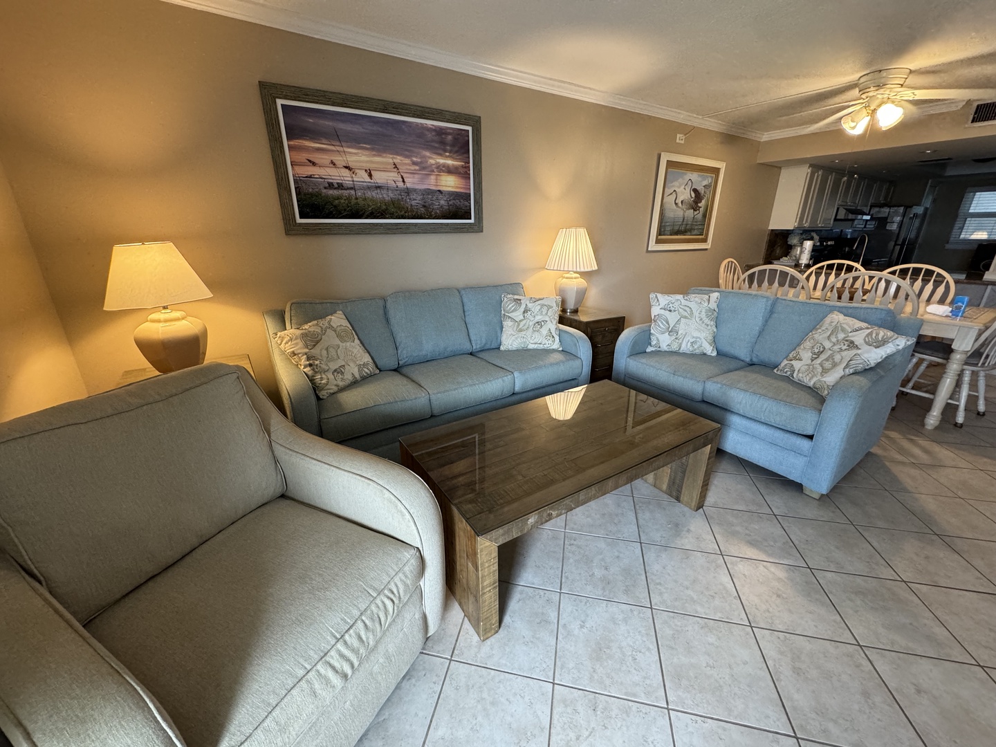 LIVING ROOM: Couch, love seat, cushioned chair