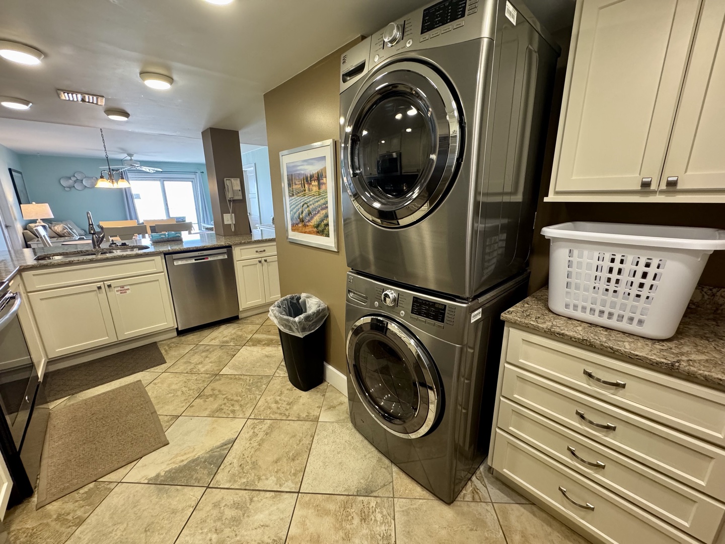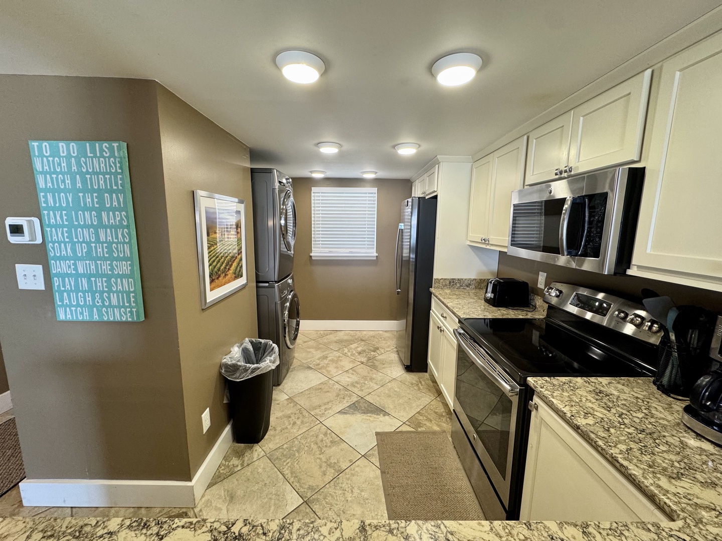 KITCHEN: Updated kitchen with quarts countertops. Stainless steel appliances. There is also a coffee maker, Keurig, toaster, stackable washer/dryer and dishwasher