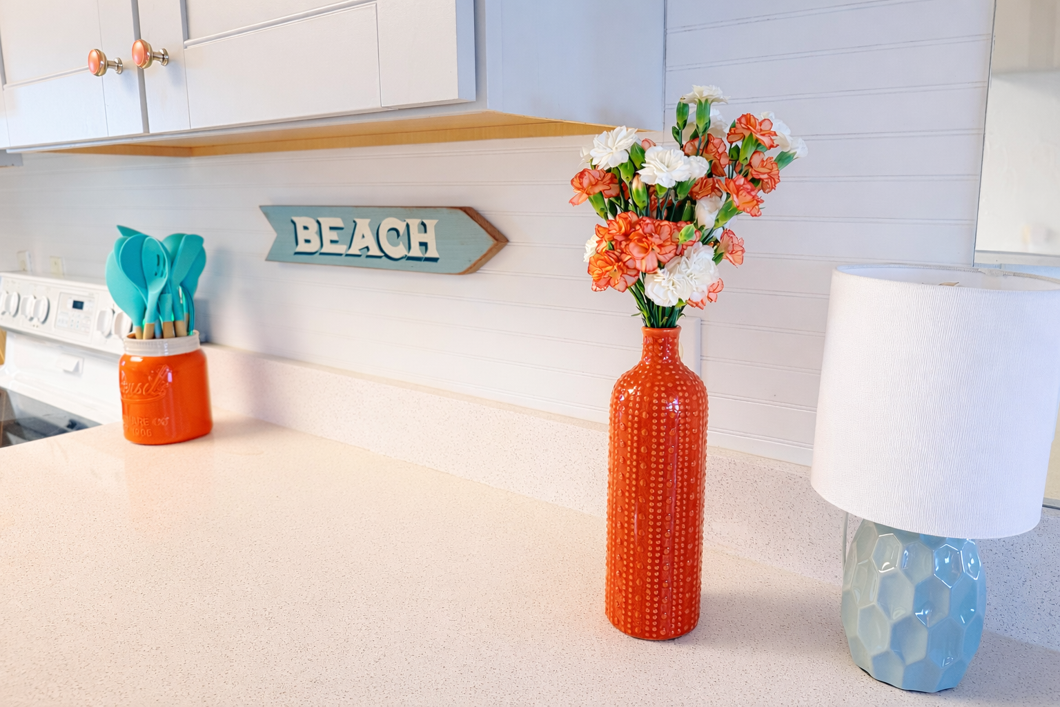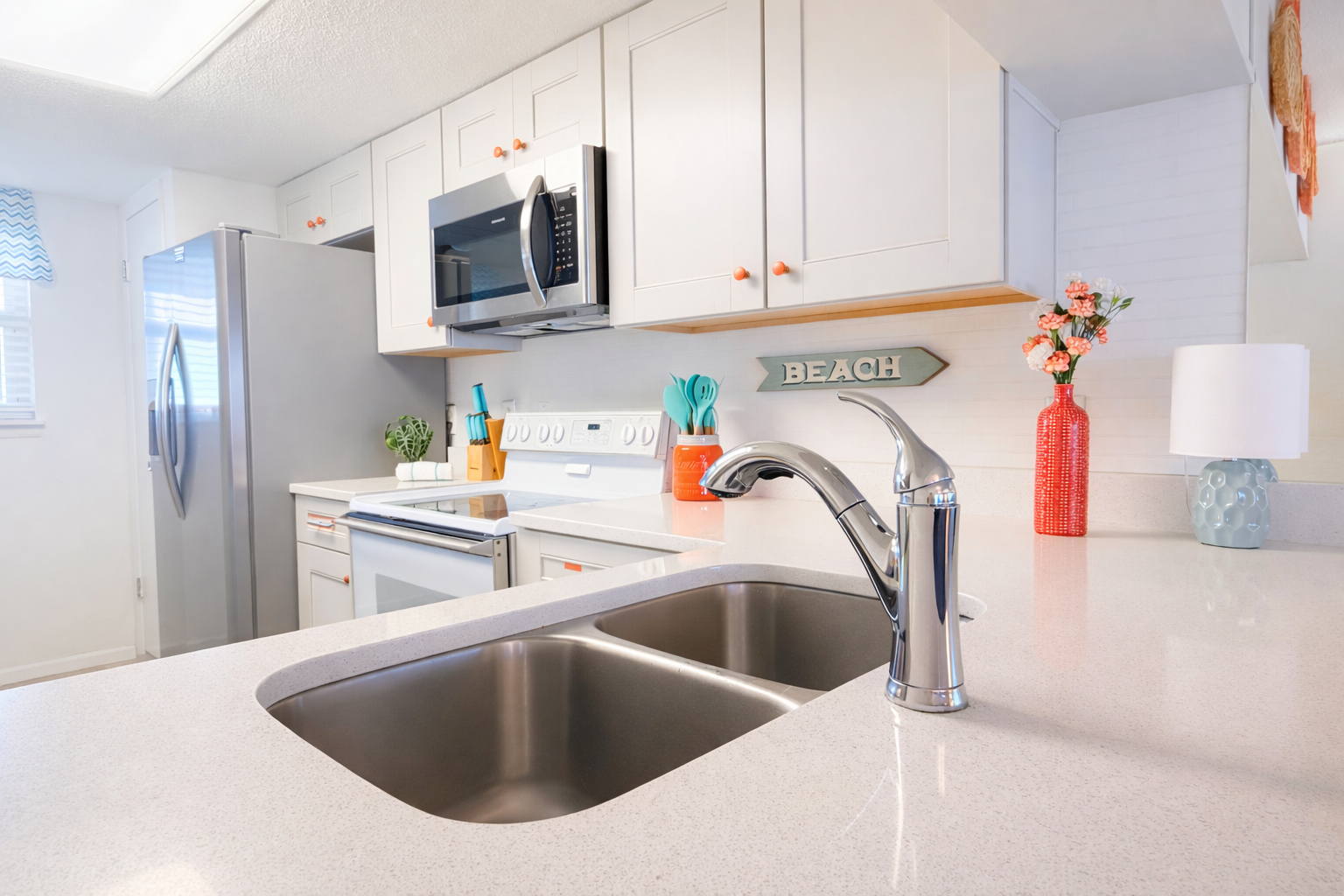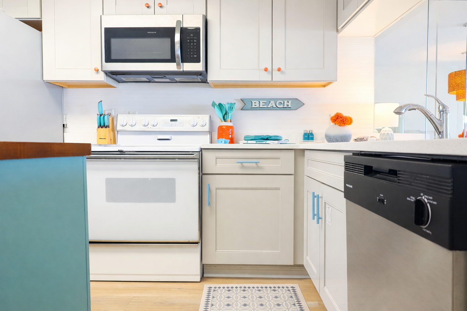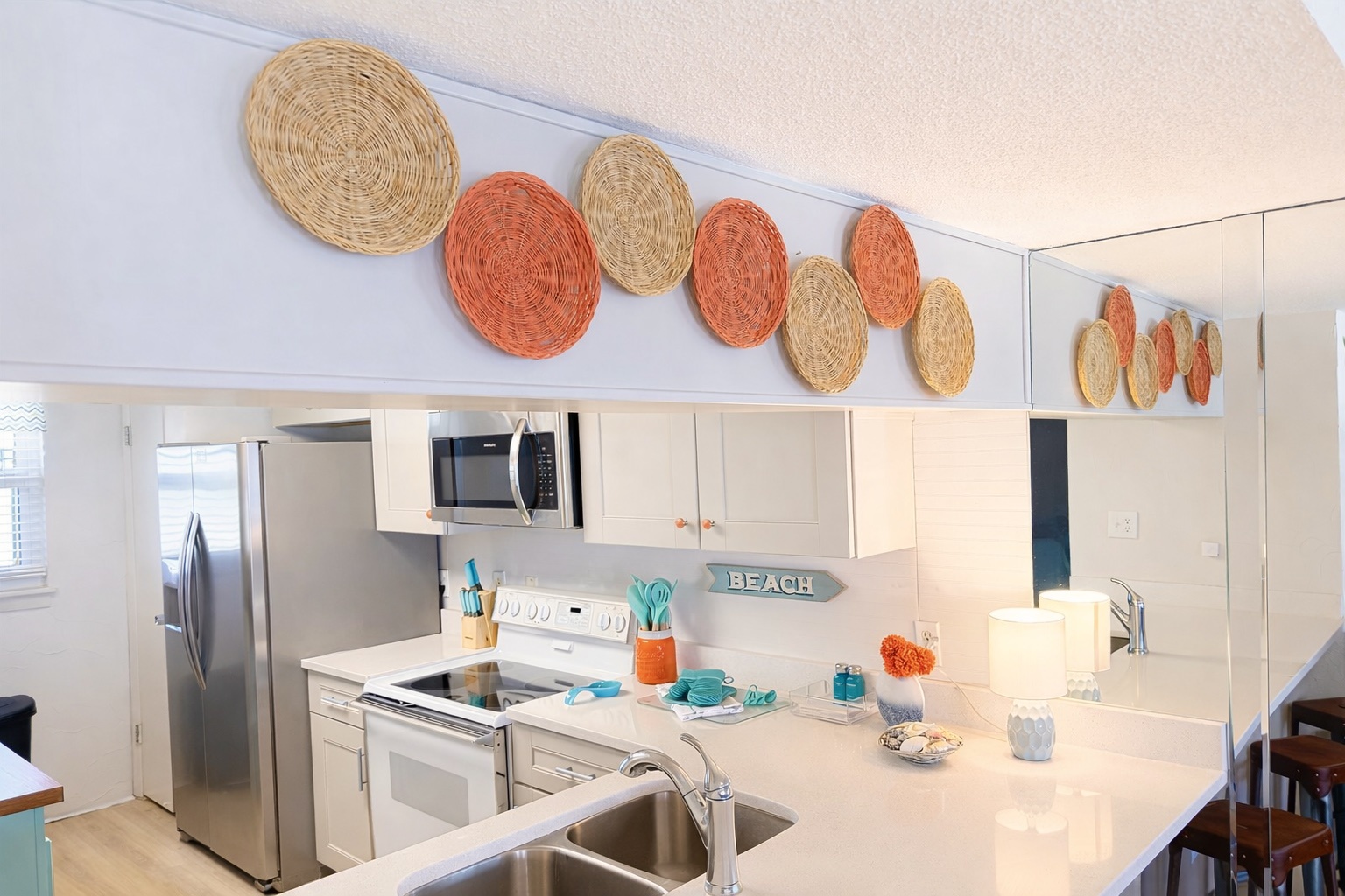 KITCHEN: Full kitchen with quartz countertops. Includes coffee maker, toaster, washer/dryer and dishwasher