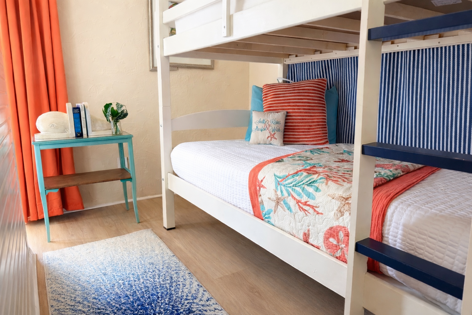 BEDROOMS: King in master bedroom, two queens in guest bedroom, set of twin bunk beds in living room.